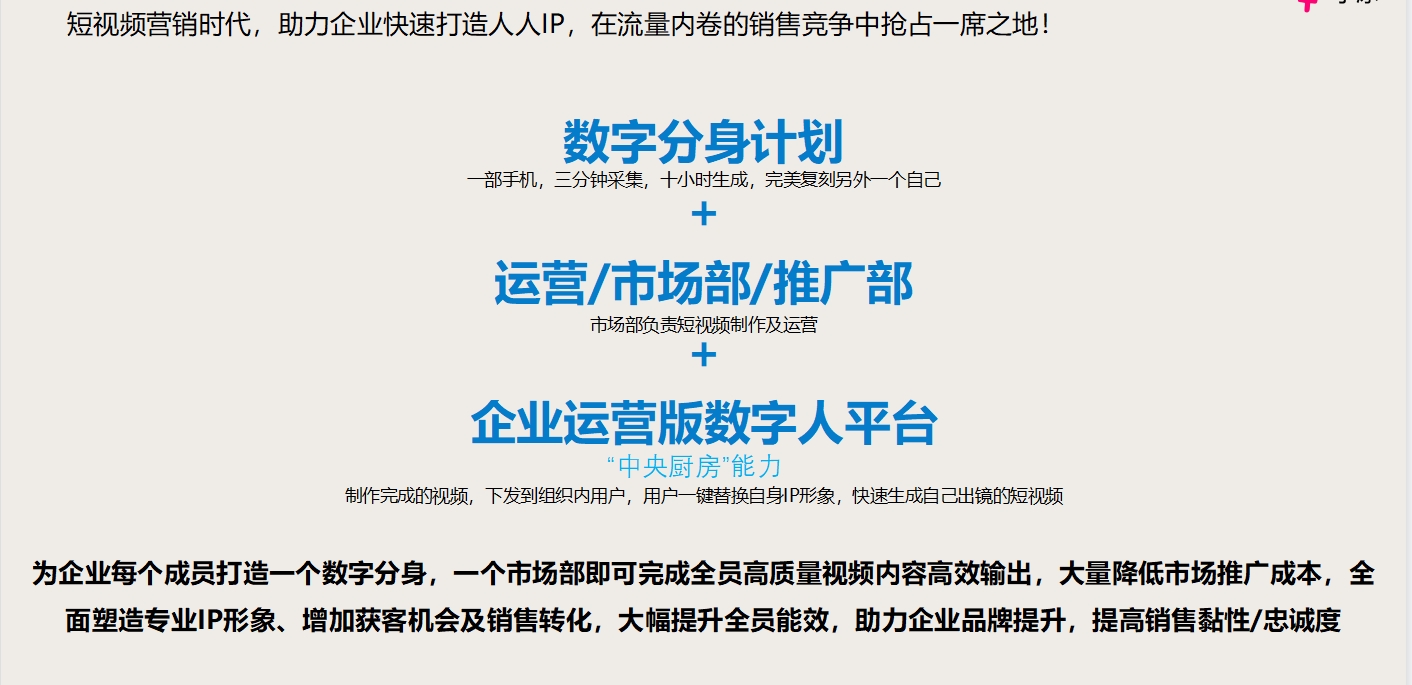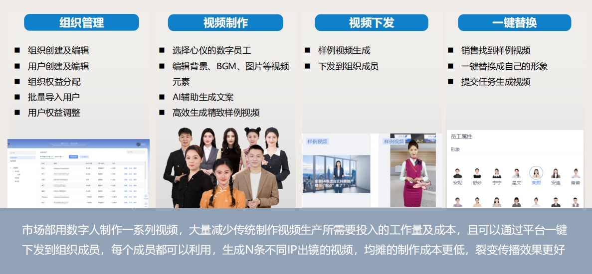 市場部用數(shù)字人制作一系列視頻,大量減少傳統(tǒng)制作視頻生產(chǎn)所需要投入的工作量及成本,且可以通過平臺一鍵下發(fā)到組織成員,每個成員都可以利用,生成N條不同IP出鏡的視頻,均攤的制作成本更低,裂變傳播效果更好。