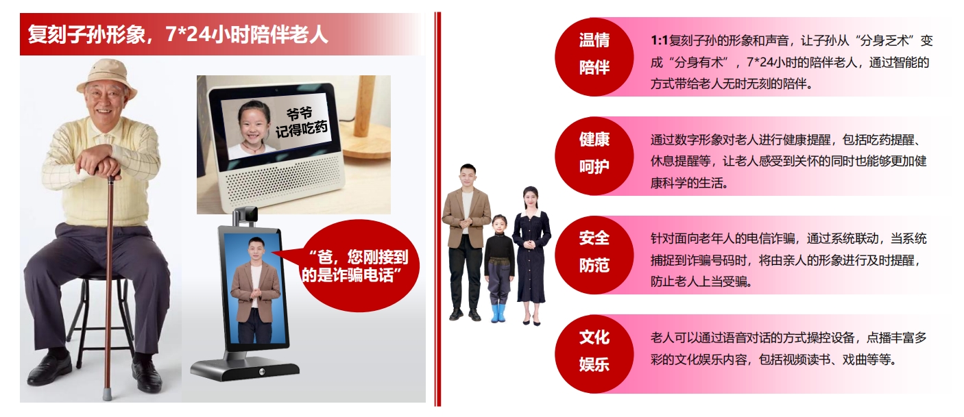 1.以子孫形象陪伴老人,信息化方式呵護老人。復(fù)刻子孫形象聲音,以親切的方式陪伴老人,并提供健康、安全、文化娛樂等豐富服務(wù),通過智慧化的方式呵護老人,幫助老年人跨越數(shù)字鴻溝,安享晚年生活。